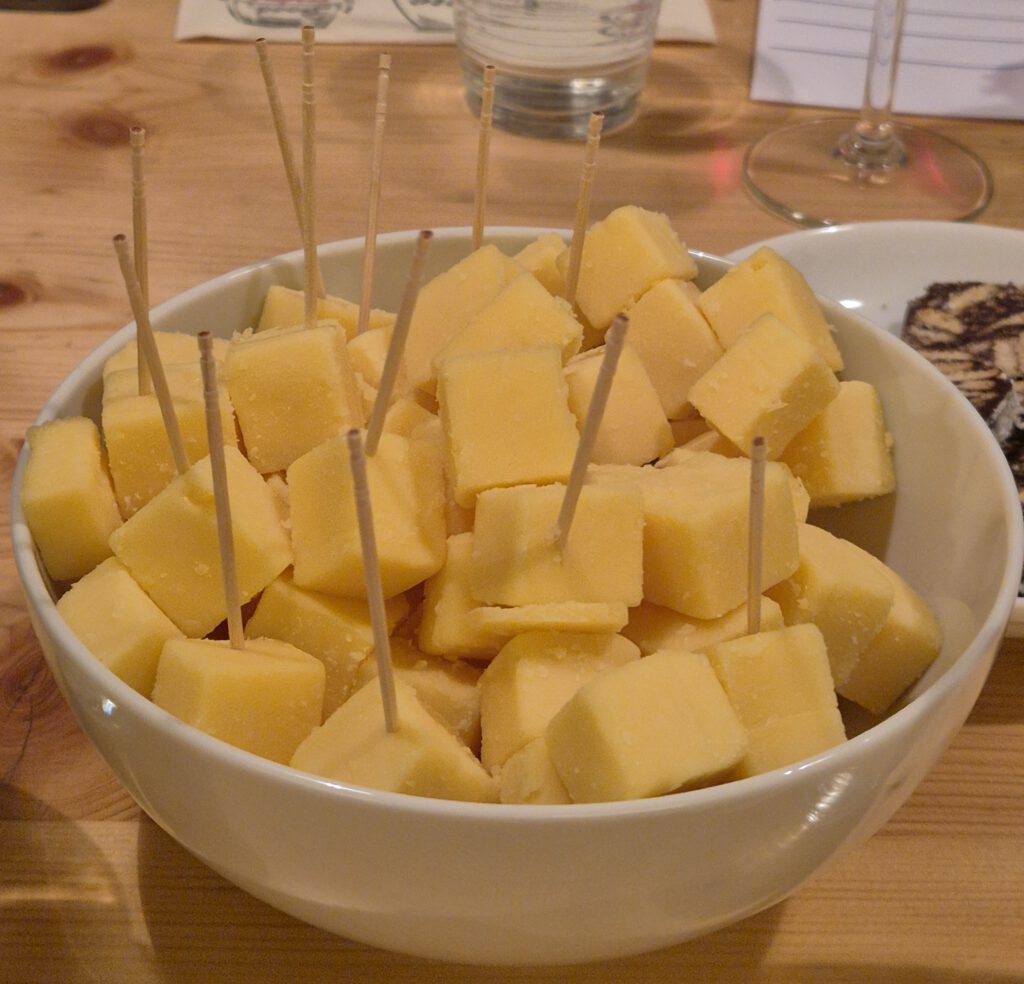 Wasser. Brot und Käsewürfel dienten der Neutralisierung des Gaumens zwischen den Weinen.