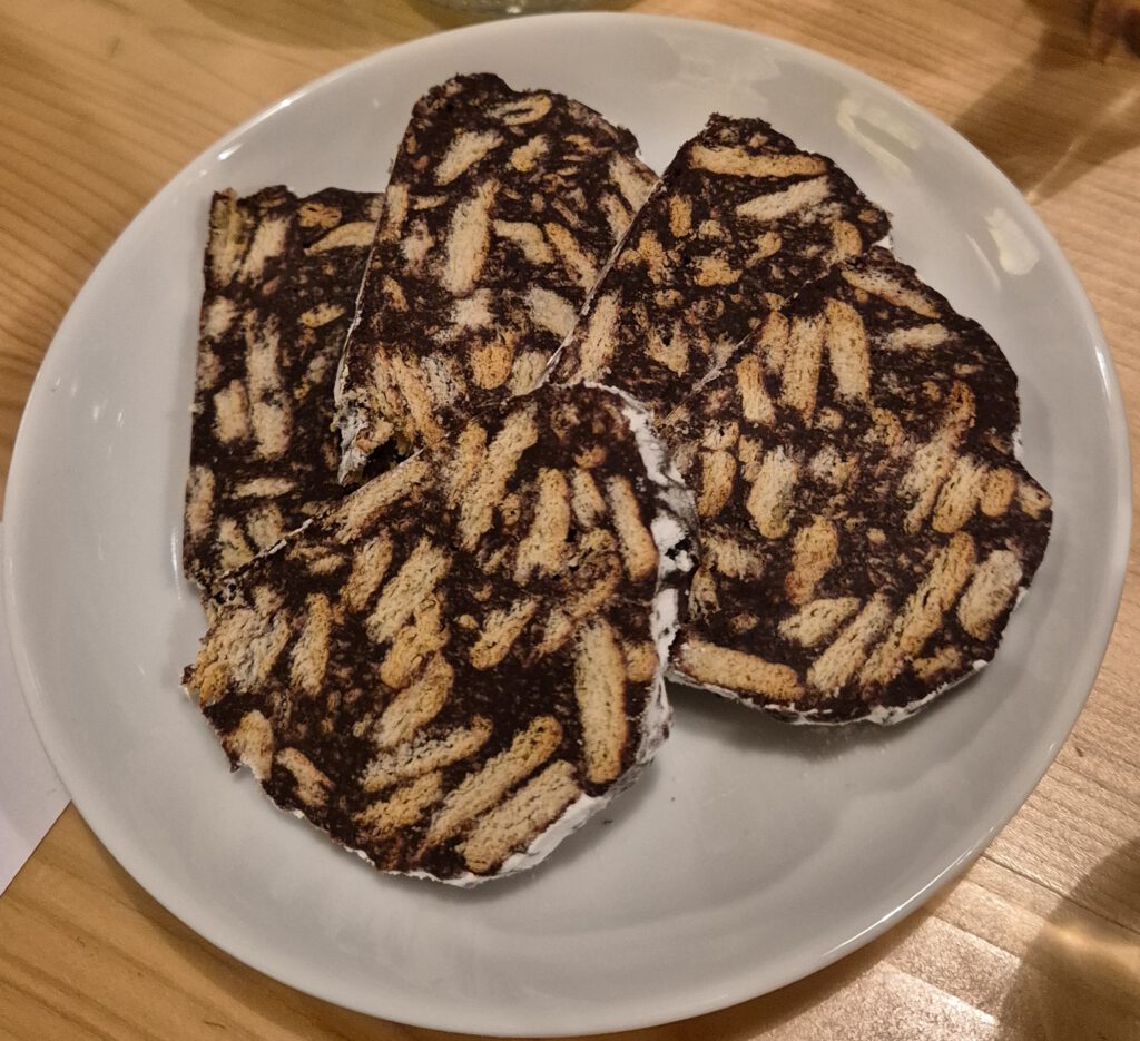 Außerdem brachte Probenteilnehmerin Irina, passend zu Rotweinen, ihre beliebte „Schokoladen-Salami“ mit, die im Laufe des Abends für herrliche Genussmomente sorgte.