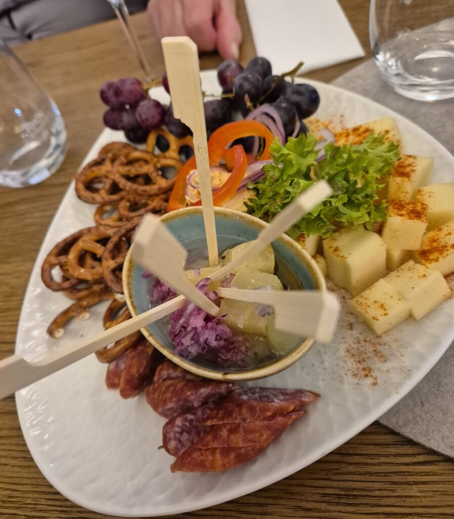 Nach dem Rieslingsekt aus Tankgärung ging es weiter mit einem Rosé Sekt aus Spätburgunder in traditioneller Flaschengärung. Der passte hervorragend zu dem sommerlichen Wetter und zum bunten Vesperteller.
