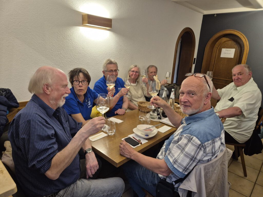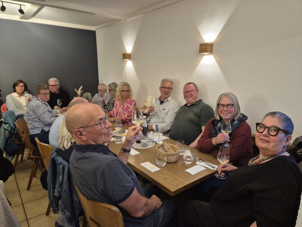 Der Reihe nach: In den kleineren Raum des Gutsausschanks passen nicht endlos viele Menschen herein, so war diese Probe sehr schnell ausgebucht, und man saß kuschelig. Jannis begrüßte die Teilnehmenden mit einem Rieslingsekt Brut, sehr beliebt in der Gastronomie, bei Vereinen und Veranstaltungen und fasste die Geschichte des Weinguts zusammen.
